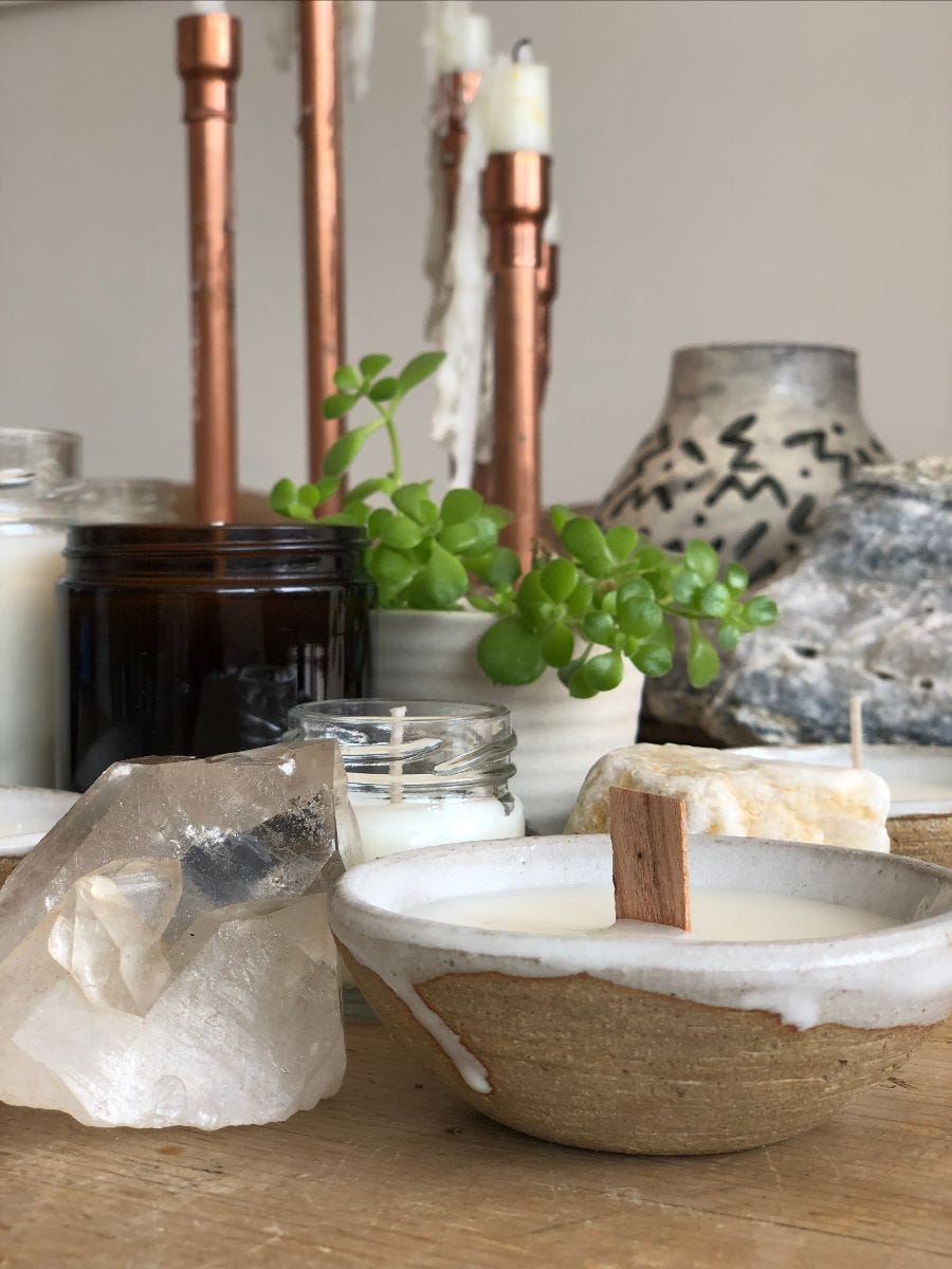 The first mini-kits, which include a 10-hour candle, raw incense jar and a rose or clear quartz, are in the shop now, and these gorgeous wooden wick candles in our signature ceramic are coming soon along with reiki mists, roll-on fragrance and SO much more.