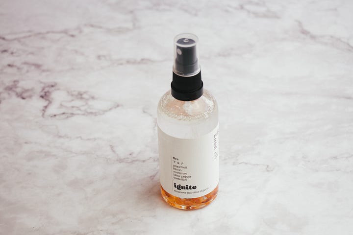 I love to use ignite on myself and my altar as I set intentions, and it’s also great for cleansing and amplifying your crystals or spritzing your yoga mat or stretching space before practice.